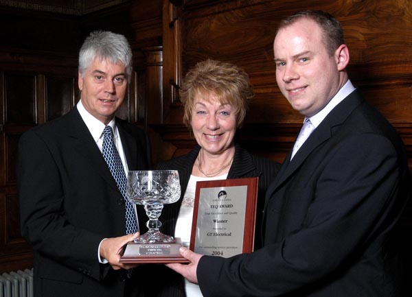 Lawrence Harrison (left) presents the prestigious TEQ Award to Vivienne and Nigel Bell from GT Electrical.