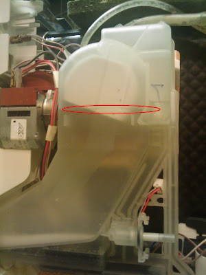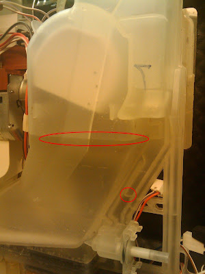 I have taken the dishwasher apart and I have taken the valve out and cleaned it. It looks to me as if the chamber is over filling and slowly draining, even though I have removed the solenoid. I have attached 2 pictures to show the water levels the 2nd picture has 2 red lines one for the main chamber and 1 for what i think is the filling tube it looks like it is draining slowly. The softener level is set to the lowest value. The water level gets so high it looks like it also leaking from the salt scoop.