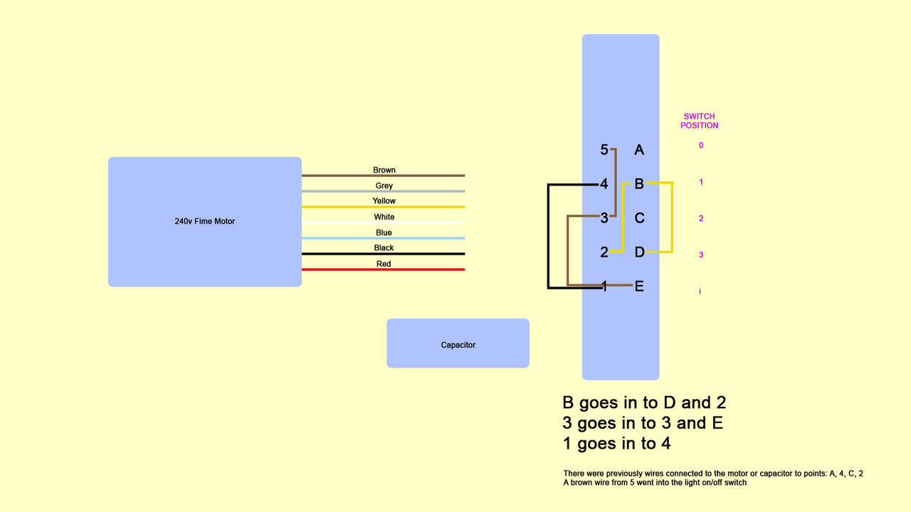 When I wired up the new motor with the same colour wires, the motor turned on at Switch Position 1, and nothing at 2 and 3. Ran it on 1 for about 15 seconds and burning smell started, so turned it all off.