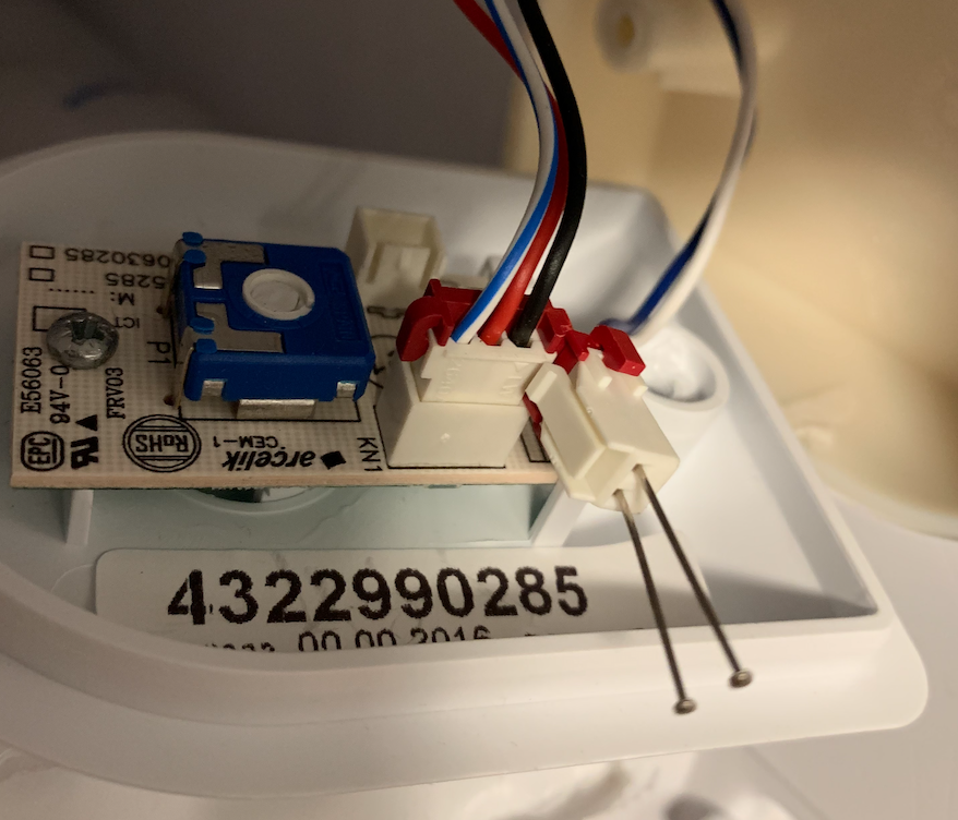 The stat *can* be replaced, it’s mounted behind the air inlet at the top and the correct part is 4394720185. There is no cable slack whatsoever. Therefore, the old sensor needs to be cut as close to it as possible, to leave enough cable left to strip back to solder to. The full loop mounting clip also needs to be cut as the replacement sensor is a little larger due to the heat shrink and the flat end of the heat shrink also needs trimming a little: