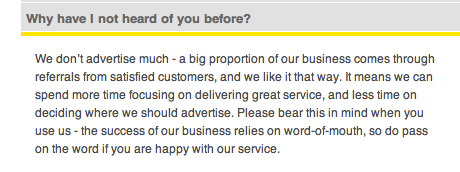 Does it not say they don’t advertise much? This gives the consumer the idea that 0800Repair is run mostly by word of mouth? That in turn generates confidence? That in turn generates a phone call or an online booking?