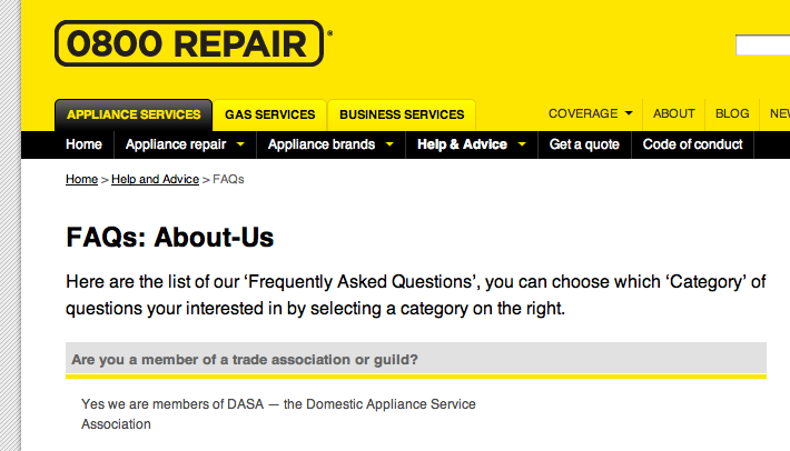 After my recent experience with dealing with different Trade Associations throughout the UK in many varying trades, I’m quite surprised that 0800 Repair are allowed to advertise that they are DASA Members, without making it clear to the consumer that they are ‘Associate Members’ and NOT all 0800 Repair Franchisees are members of DASA.