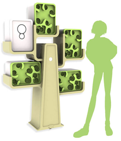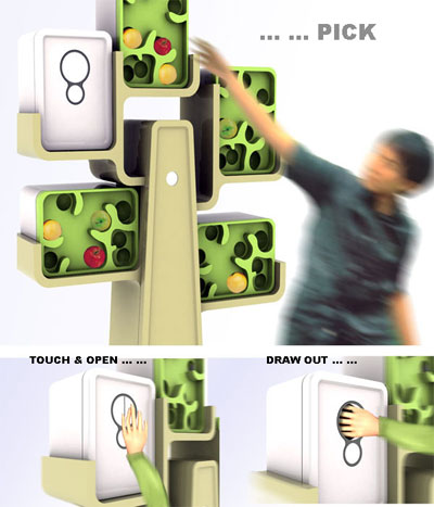It appears that you can store pieces of fruit in its branch-like modules and ,when you take out a piece of fruit, it feels like you’re picking it off a tree.
